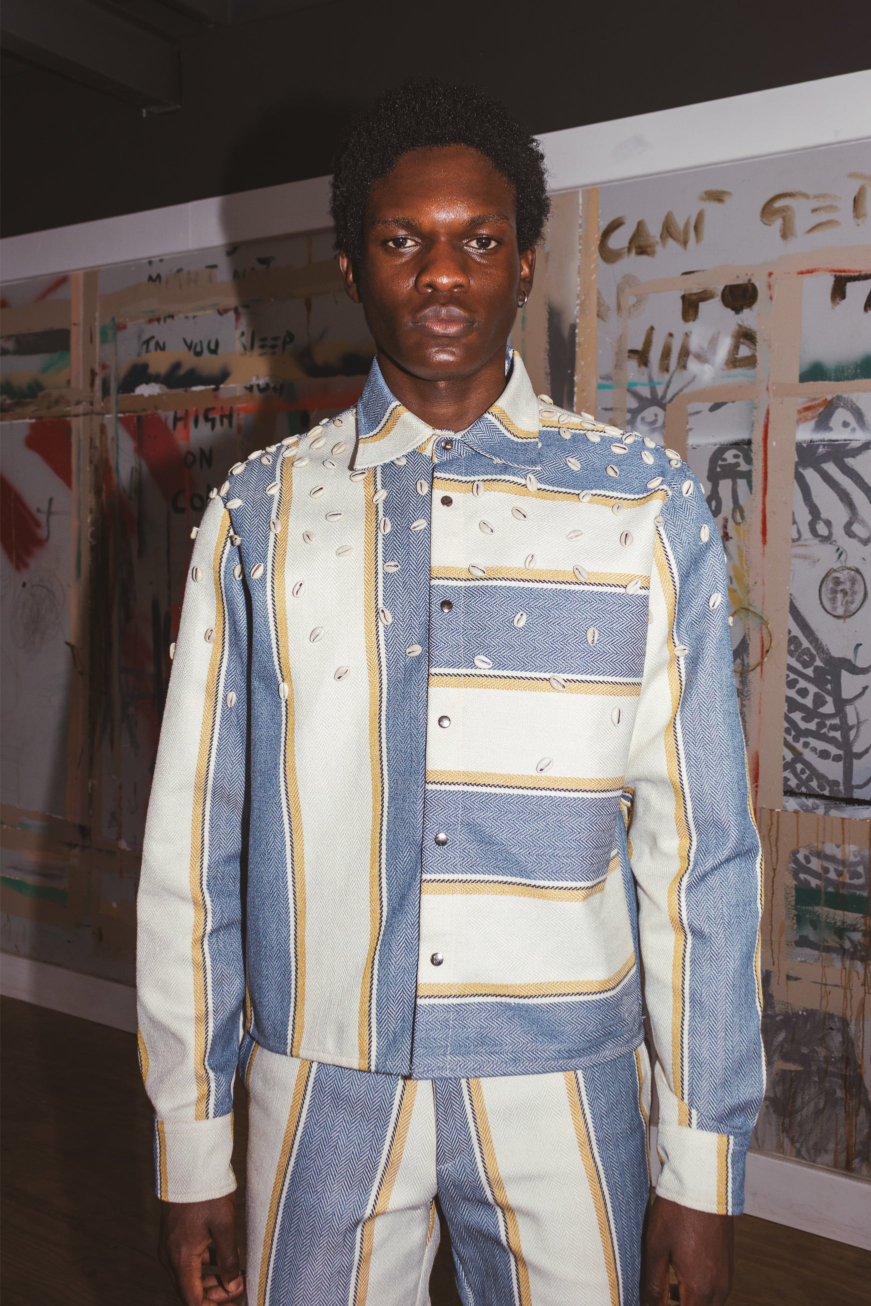 A boxy long sleeve shirt in a classic wide stripe flannel. Metal press stud fastenings with hand sewn beaded detailing.