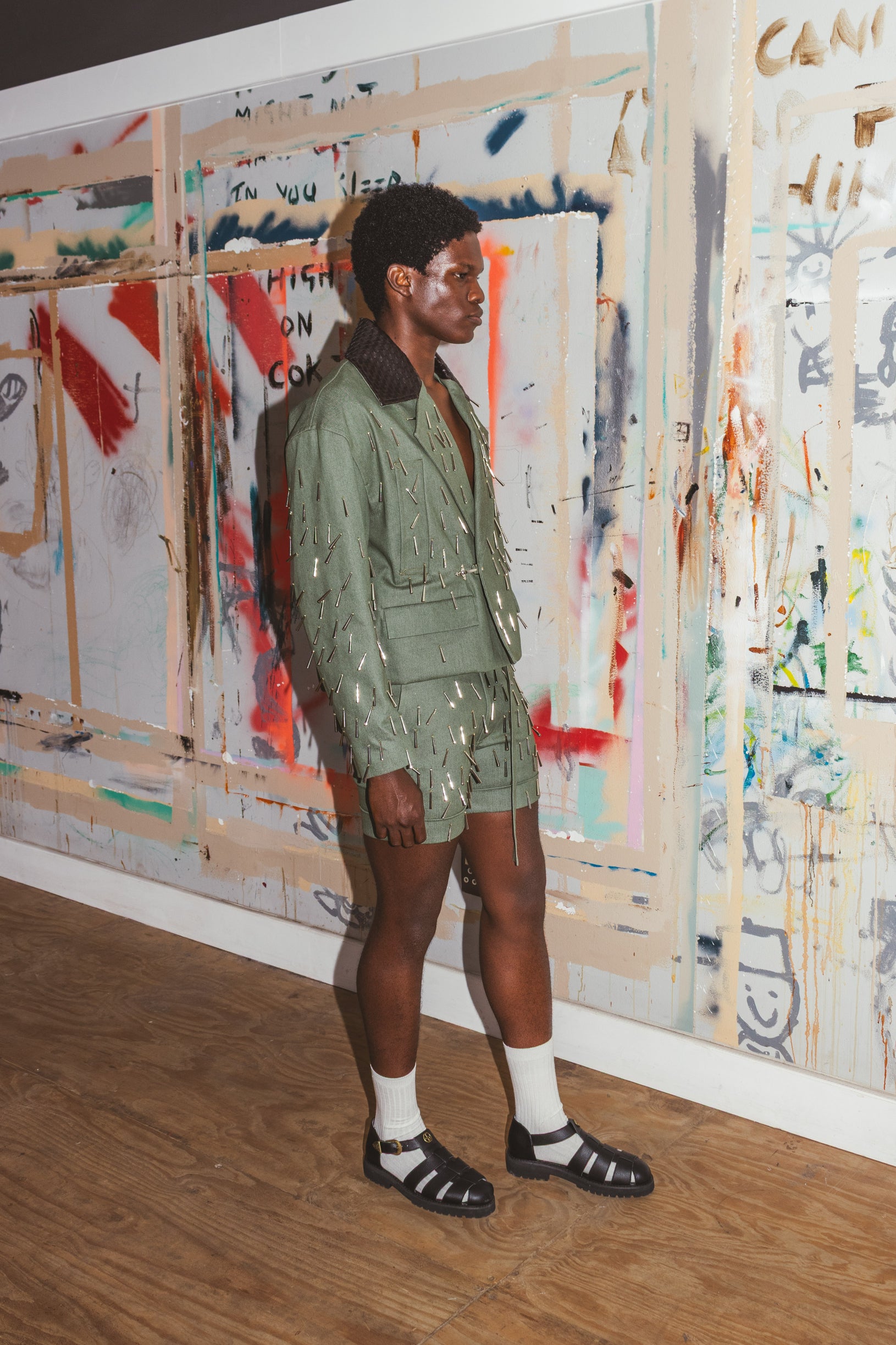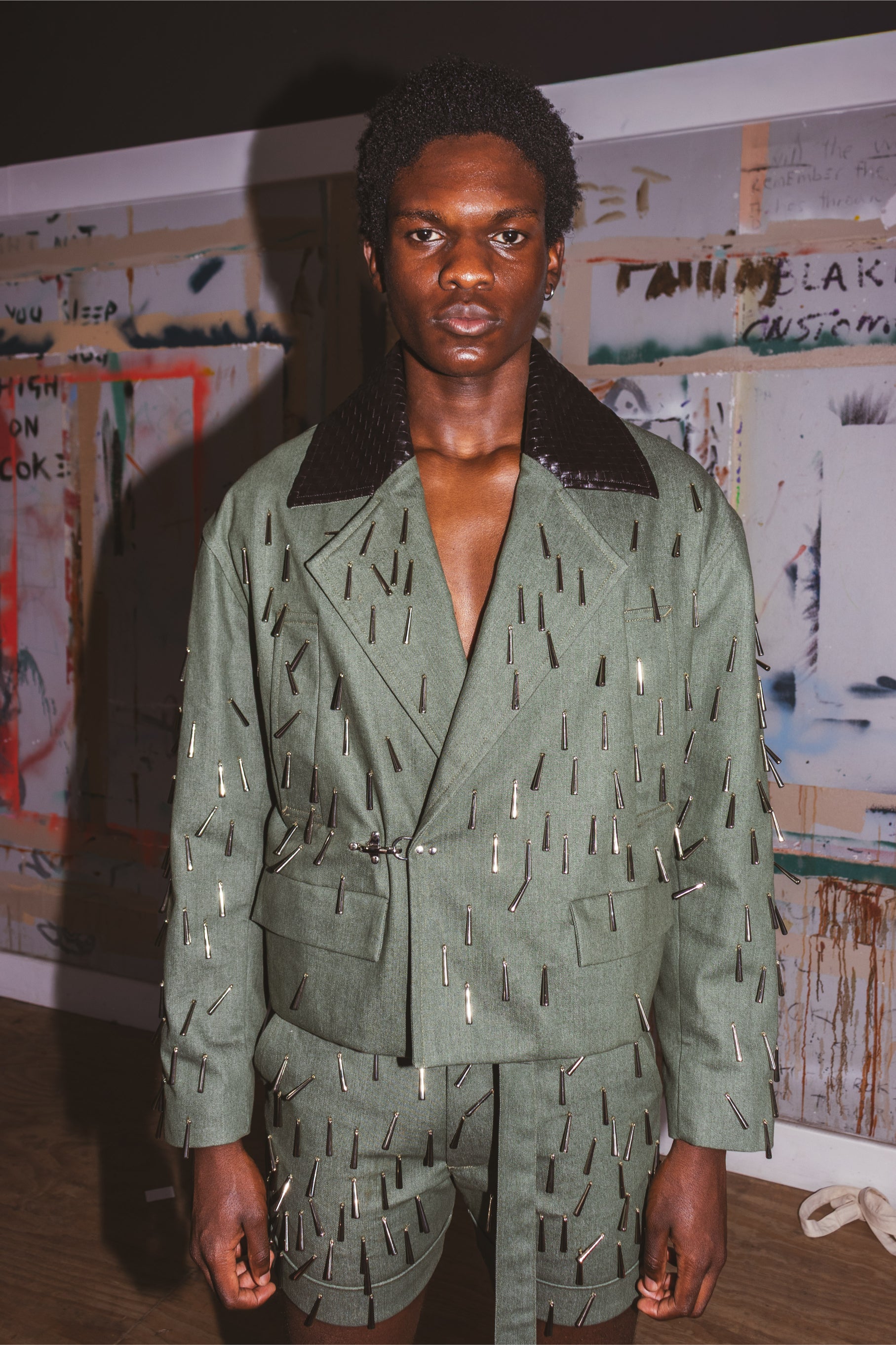 A cropped double breasted blazer in a luxe sage green denim. Woven vinyl collar, welt pockets with metal clasp fastening. Hand beaded detailing.