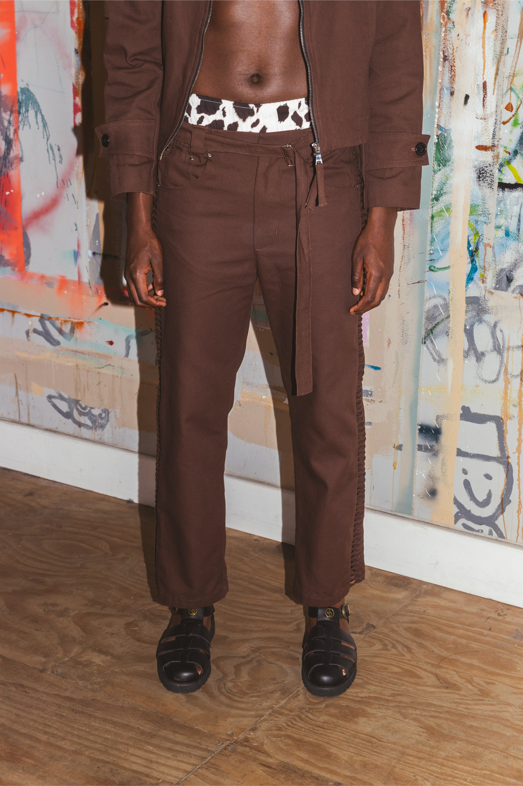 A straight leg denim style trouser in rich brown denim. Metal zipper and hook-and-eye fastenings. Patch pockets with twisted loop cut-out side panelling.